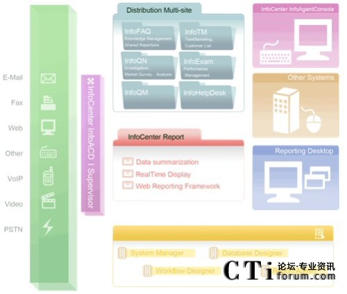 由于今日的客服中心已是多媒體的客服中心,不再只有單純的電話進(jìn)線,客戶尋求服務(wù)的管道更多樣化,InfoCenter Total Solution可以完全整合應(yīng)用程序、數(shù)據(jù)倉儲系統(tǒng)、多媒體溝通互動管道,藉由不同的系統(tǒng)達(dá)到分析與處理客戶需求,并且達(dá)到一致性的工作流程管理,提供更高質(zhì)量的服務(wù)。