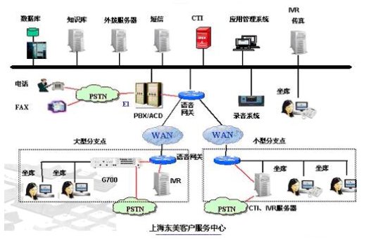 中心點和分支點的客服系統(tǒng)通過兩地的語音網(wǎng)關(guān)進行語音連接,具體實現(xiàn)大概是,如果分支點需要把語音轉(zhuǎn)接到中心點,分支點把TDM語音轉(zhuǎn)接到語音網(wǎng)關(guān),語音網(wǎng)關(guān)把TDM語音信號轉(zhuǎn)變?yōu)镮P包,通過網(wǎng)絡(luò)發(fā)送到中心點的語音網(wǎng)關(guān)上,語音網(wǎng)關(guān)把IP包變?yōu)門DM語音信號,在接入到交換機上,由中心點CTI按照指定的策略轉(zhuǎn)接到最終目標(biāo)上。