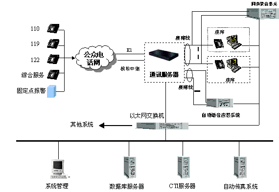 綜合接警平臺主要由hxd09可編程智能語音交換機和計算機網絡兩部分組成,交換機負責110、119、122報警電話的接入與分流及調度呼出等功能;計算機網絡則完成110、119、122報警信息的顯示、數(shù)據(jù)儲存、統(tǒng)計及信息查詢、發(fā)布功能。