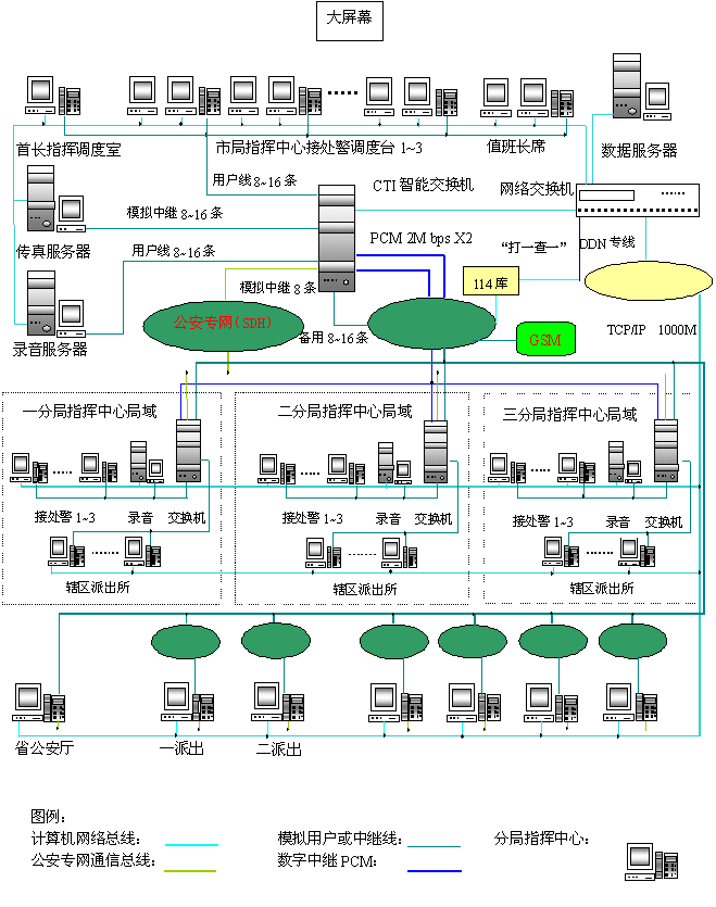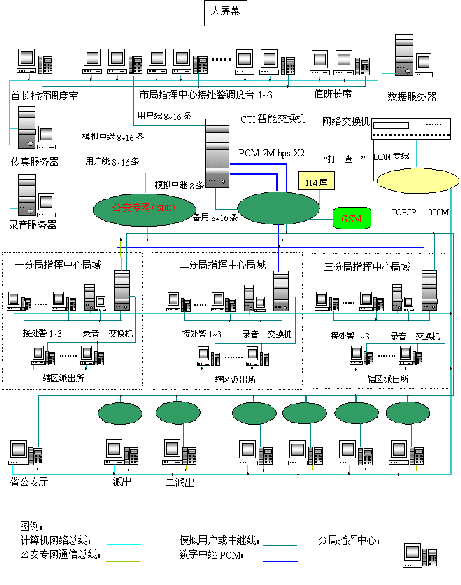 - 樹立大網絡概念:采用先進的通訊、計算機網絡技術(采用CTI可編程交換技術),利用現(xiàn)有的通信資源,實現(xiàn)市局指揮中心與消防大隊、交警大隊、各派出所的計算機網絡及相關領導辦公室計算機大聯(lián)網;形成全市范圍內110、119、122有線、無線全方位立體調度語音通道大網。
