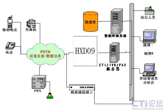 “系統(tǒng)”主要由以下幾部分組成:HXD09語(yǔ)音交換機(jī)、CTI Server服務(wù)器、數(shù)據(jù)庫(kù)系統(tǒng)、業(yè)務(wù)處理系統(tǒng)以及座席(業(yè)務(wù)代表)、呼叫管理系統(tǒng)、呼叫監(jiān)控系統(tǒng)幾項(xiàng)業(yè)務(wù)組成。