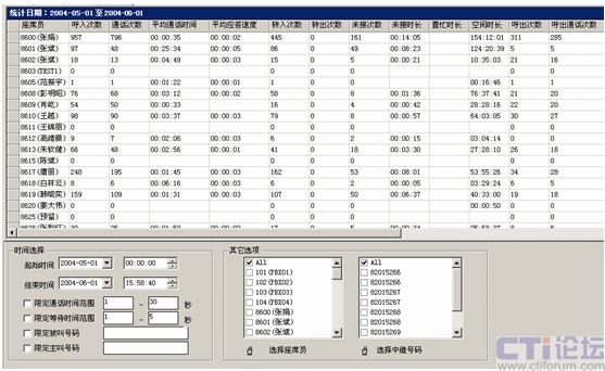 “系統(tǒng)”平臺(tái)可實(shí)現(xiàn)對(duì)整個(gè)電話咨詢的實(shí)時(shí)監(jiān)控,可以獲得任意一段時(shí)間內(nèi)中繼線的使用情況、座席的使用情況及工作狀態(tài)、進(jìn)出隊(duì)列等,通過(guò)多種圖示、詳細(xì)數(shù)據(jù)報(bào)表,可以找出一天、一周或一個(gè)月內(nèi)呼入總量、瞬間呼入峰值、呼入量分布特點(diǎn)等,從而合理地系統(tǒng)資源和值班人員,在緊急時(shí)間可適當(dāng)?shù)卦鰷p中繼線、座席、IVR端口的數(shù)量,確保系統(tǒng)運(yùn)行最為經(jīng)濟(jì),合理;還可以通過(guò)座席員接打電話情況報(bào)表,對(duì)座席員進(jìn)行科學(xué)的考評(píng)。
