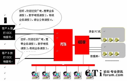 本系統(tǒng)物理結(jié)構(gòu)HXD交換機、CTI服務(wù)器、IVR(交互式語音應(yīng)答)/IFR(交互式傳真應(yīng)答)服務(wù)器、業(yè)務(wù)代表座席(邏輯上分為:普通業(yè)務(wù)代表座席、專家座席等)、班長座席、統(tǒng)計維護管理工作站、因特網(wǎng)(WEB)服務(wù)器、數(shù)據(jù)庫/應(yīng)用服務(wù)器、錄音工作站、網(wǎng)絡(luò)系統(tǒng)等構(gòu)成。