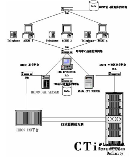 HXD09交換機(jī)通過(guò)E1上的信令完成控制話(huà)路,同時(shí)由FAX/IVR SERVER完成業(yè)務(wù)控制如放音、收號(hào)、收發(fā)傳真等。