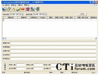 指揮中心信息查詢系統(tǒng)基于客戶/服務器方式。支持全中文檢索及模糊查詢、組合條件查詢、記錄瀏覽查詢、綜合查詢、提供指揮中心與信息中心間數據的雙向數據流動等功能。還可對120相關信息進行錄入、分類、保存、歸檔、管理維護,并提供檢索及查詢、綜合匯總、報表生成、統(tǒng)計打印及發(fā)送給領導審閱等功能,并可跟蹤值機人員對120報警的受理急救、指揮的每一步驟的處理情況。