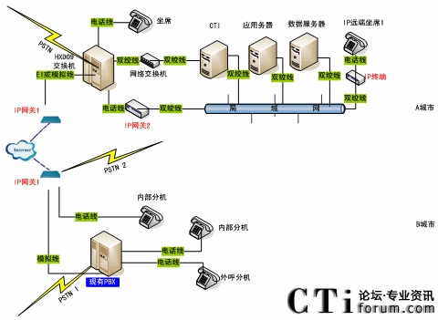 根據(jù)上述需求,我公司提出了電信PSTN網(wǎng)與IP網(wǎng)結(jié)合的IP語音解決方案,單位內(nèi)部呼叫采用IP網(wǎng)絡(luò),而對外呼出采用電信PSTN網(wǎng)絡(luò)。這套方案兩個主要原則:第一,最佳化地利用現(xiàn)有網(wǎng)絡(luò)資源,最大化地節(jié)省通話費用;第二與現(xiàn)有電信電話交換網(wǎng)絡(luò)實現(xiàn)無縫連接,即電信PSTN呼入后,可以任意的轉(zhuǎn)接到本地分機(jī)或IP分機(jī),實現(xiàn)PSTN與IP網(wǎng)的平滑聯(lián)結(jié)。因此部署實施這個方案中,關(guān)鍵是內(nèi)部IP網(wǎng)絡(luò)保持暢通,以滿足高質(zhì)量的IP話務(wù)。