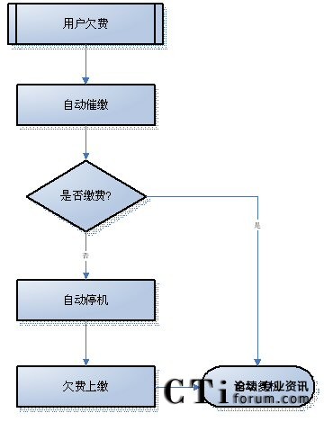 - 支持對(duì)預(yù)付費(fèi)用戶催繳:該類用戶采用先交費(fèi),后打電話,預(yù)付費(fèi)用完即視為欠費(fèi),系統(tǒng)開始催繳。一旦用戶到營(yíng)業(yè)窗口補(bǔ)交話費(fèi),系統(tǒng)即停止催繳;