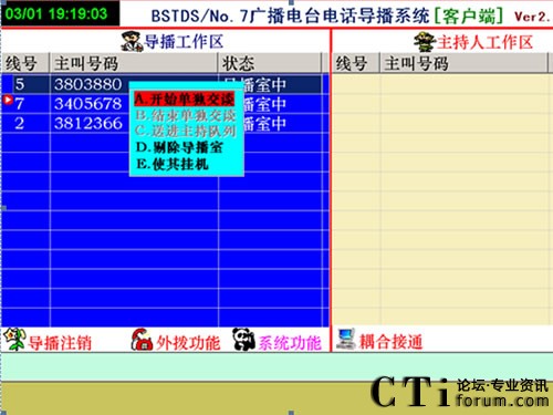 在上圖中,如想接通3803880的電話就出現(xiàn)了上述菜單,在上述菜單中有5種選擇,開始單獨交談、結(jié)束單獨交談、送進主持隊列、剔除導(dǎo)播室、使其掛機。點擊[開始單獨交談]出現(xiàn)如下畫面: