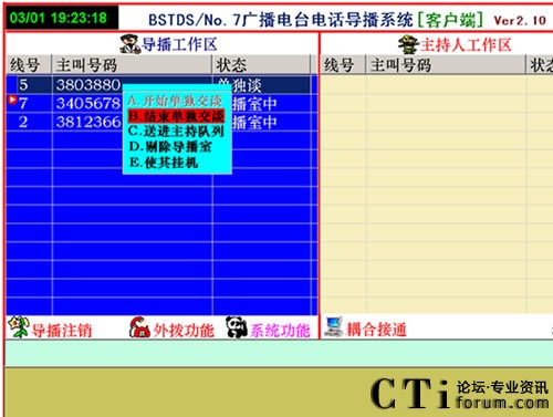 如想接聽哪個電話號碼,用右鍵點擊這個號碼會出現(xiàn)菜單,在菜單中只有三種命令可以選擇“單獨交談”“剔除導(dǎo)播室”“使其掛機”。點擊“開始單獨交談”后拿起電話聽筒,這時導(dǎo)播可以單獨同參與者通話了,其他參與者聽不到交談,只能聽到音樂聲,導(dǎo)播問明參與者參與內(nèi)容后須接入直播間的,應(yīng)按“結(jié)束單獨交談”后點擊“送到主持列隊”送到主持人區(qū)等待主持人同參與者交談。