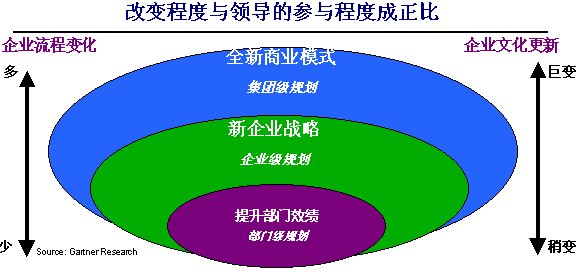 成功實(shí)施CRM的第一個(gè)關(guān)鍵是贏得企業(yè)的高層支持。高層支持的項(xiàng)目,或稱“一把手”工程,往往能夠推行得比較順利。在我們的實(shí)施中,最經(jīng)常項(xiàng)目牽頭人是客戶方負(fù)責(zé)運(yùn)營(yíng)的老總或總經(jīng)理。企業(yè)要應(yīng)用CRM系統(tǒng),不應(yīng)當(dāng)僅僅是信息部門或銷售部門內(nèi)部的事情,而應(yīng)當(dāng)是整個(gè)企業(yè)在高層領(lǐng)導(dǎo)的直接參與指導(dǎo)之下的多方協(xié)同調(diào)整,因?yàn)镃RM涉及的是市場(chǎng)、銷售、服務(wù)等多個(gè)與客戶打交道的部門和流程。企業(yè)內(nèi)部的高層管理者必須承擔(dān)起項(xiàng)目負(fù)責(zé)人的角色,才能讓CRM實(shí)施順利地開(kāi)展,才能完成部門之間的協(xié)同,才能實(shí)現(xiàn)企業(yè)內(nèi)部的文化轉(zhuǎn)變。高層參與的程度可以由下面的圖示說(shuō)明: