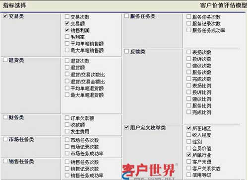 TurboCRM在長期支持CRM應用實踐過程中,總結出一套完整實用的客戶價值評估模型,評估指標包括交易類、財務類、服務類、反饋類、枚舉類、自定義指標等(如圖),結合不同的指標可以幫助企業(yè)評估客戶價值。