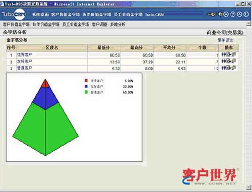根據預先設定的客戶價值評估模型,CRM會自動計算出每個客戶的價值得分以及對應到不同等級的客戶價值,并會記錄到客戶項下,便于業(yè)務人員在與客戶接觸時,直觀了解客戶價值情況?蛻魞r值金字塔分析(如圖),可以動態(tài)的了解各類客戶的價值分布。