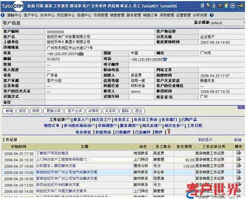 信息整合是CRM系統實現對客戶信息進行管理的基礎,將客戶的各類信息進行關聯,當查詢某個客戶時,與該客戶相關的歷史接觸記錄、交易記錄都可一目了然地展現出來,也可以方便地進行相關信息的及時錄入。(如下圖)