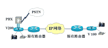 方案說明:以快速以太網口接入數據網絡,V200-2FXO接本地PBX或直接連入PSTN,V200-2FXS直接提供兩路話音接入。