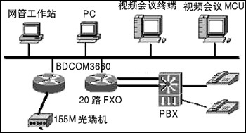 通過在BDCOM3660路由器上配置相應(yīng)的CE1、語(yǔ)音等功能模塊,中心20個(gè)E1接口可通過SDH連接17個(gè)地市氣象局和重要的氣象站(共20個(gè)),同時(shí)可供20部電話用以VoIP通話;中心BDCOM3660路由器每臺(tái)配兩個(gè)10/100M以太網(wǎng)端口,使得數(shù)據(jù)和視頻分開,防止網(wǎng)絡(luò)的廣播風(fēng)暴。