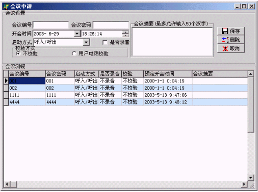 5. 校驗(yàn)方式有'不校驗(yàn)'和'用戶電話校驗(yàn)','不校驗(yàn)'是指所有電話撥打會(huì)議,系統(tǒng)都會(huì)接入;'用戶電話校驗(yàn)'是指撥入會(huì)議系統(tǒng)的電話號(hào)碼是系統(tǒng)會(huì)議成員的電話號(hào)碼,否則,系統(tǒng)不會(huì)接入。