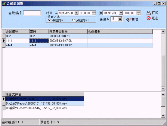 可對歷史會(huì)議記錄進(jìn)行管理,查看記錄內(nèi)容幾錄音文件(WAV文件格式),以便回放調(diào)聽,可對報(bào)表進(jìn)行導(dǎo)出或打印操作