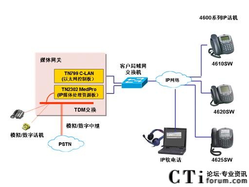 IP終端通過企業(yè)的數(shù)據(jù)網(wǎng)絡平臺進行部署,媒體網(wǎng)關上配置相應的IP板卡為IP電話終端提供登錄、注冊和語音處理,如下圖所示: