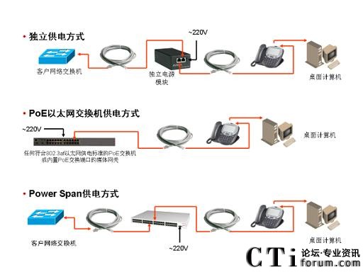 IP電話相對于原有模擬分機或數(shù)字分機采用以太網(wǎng)端口連接,其供電方式也相應隨之改變,46xx系列IP硬件話機支持以下3種供電方式: