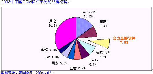 HOLLYCRM(合力金橋軟件)公司作為實力卓越的CRM主流廠商, 致力于提供最專業(yè)化的應用軟件和服務,提供以客戶為核心的信息化解決方案,服務領域跨越電信運營商、金融業(yè)、制造業(yè)等行業(yè)。在電信行業(yè)的CRM市場中,合力金橋軟件處于穩(wěn)固領先位置, 其推出的客戶關系管理解決方案,覆蓋協(xié)作型、運營型和分析型的全部范疇。在CRM產(chǎn)業(yè)在2003年的中國發(fā)展態(tài)勢整體放緩的大環(huán)境下, HOLLYCRM卻一枝獨秀, 在不到一年的時間里簽下中國網(wǎng)通總部、天津網(wǎng)通、山西網(wǎng)通、內(nèi)蒙聯(lián)通等大型CRM項目,積累了豐富的CRM項目實施經(jīng)驗。在累計的電信行業(yè)CRM軟件市場中,合力金橋軟件一家占有份額就達到24%, 合力金橋軟件此次在CCID年度研究報告中倍受矚目可謂眾望所歸, 充分說明了其CRM產(chǎn)品在高端行業(yè)的領軍地位, 如圖: