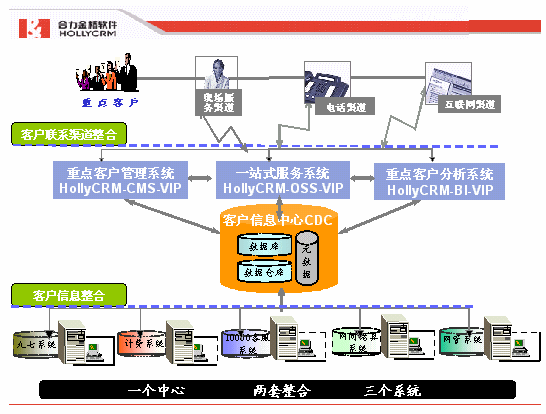 HOLLYCRM(合力金橋軟件)基于電信行業(yè)IT發(fā)展和山東省通信公司重點客戶管理系統(tǒng)建設目標和原則的要求,根據(jù)多年來對電信CRM領(lǐng)域的研究以及在實際項目建設實施過程中的經(jīng)驗獲得,科學地提出了針本項目的"一個中心,二套整合,三個系統(tǒng)"的建設理念。如下圖:
