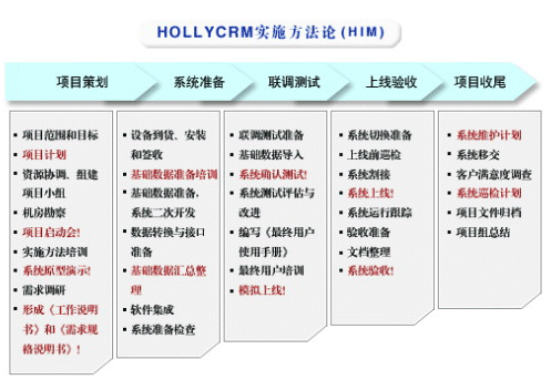 HOLLYCRM(合力金橋軟件)公司是國(guó)內(nèi)最早從事呼叫中心應(yīng)用軟件開(kāi)發(fā)與服務(wù)公司,在多年的實(shí)踐經(jīng)驗(yàn)基礎(chǔ)上形成了完整的“456”呼叫中心“項(xiàng)目實(shí)施方法論”(HIM:HOLLYCRM Implementary Methodology),即“四大實(shí)施策略、五個(gè)項(xiàng)目階段、六大管理專(zhuān)題”。該體系的有效運(yùn)行對(duì)公司項(xiàng)目的成功上線和推進(jìn)軟件產(chǎn)品的成熟將起到至關(guān)重要的作用。