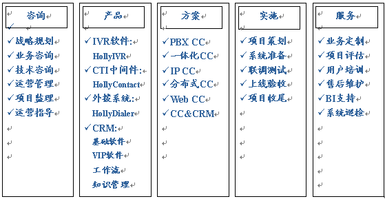 HollyC6支持的業(yè)務(wù)類(lèi)型包括:客戶服務(wù)中心、咨詢熱線、電子商務(wù)中心、服務(wù)受理中心、預(yù)訂中心、電話營(yíng)銷(xiāo)中心、技術(shù)支持中心等。
