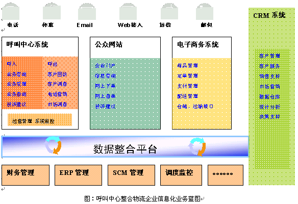 為解決傳統(tǒng)物流企業(yè)"成本高"、"效率低"的瓶頸問題,物流行業(yè)信息化目前已經(jīng)超越了關(guān)注和觀望,第一層次的信息化平臺在很多企業(yè)已經(jīng)實施,如內(nèi)部的財務(wù)管理、倉儲管理、定單管理、運(yùn)輸管理等,相關(guān)系統(tǒng)包括ERP、物流管理(LM)、SCM等應(yīng)用系統(tǒng)。更進(jìn)一步,針對物流企業(yè)核心是提供"服務(wù)"這個概念,呼叫中心、電子商物、以及CRM技術(shù)的結(jié)合將對物流基礎(chǔ)信息平臺起到至關(guān)重要的整合作用: