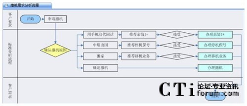 客戶呼入之后,座席人員要做的第一件事情就在IT系統(tǒng)的支持下先去捕獲客戶訴求,不用擔(dān)心座席會(huì)混淆相似的業(yè)務(wù)類型,因?yàn)楹艚兄行尼槍?duì)典型的業(yè)務(wù)訴求會(huì)做出非常詳盡的引導(dǎo)流程,相似的或者關(guān)聯(lián)的業(yè)務(wù)類型在此流程中會(huì)體現(xiàn)出來(lái),座席人員可以點(diǎn)擊,快捷地出入于各業(yè)務(wù)類型的引導(dǎo)圖,通過(guò)比較、判斷,最終定位出客戶真正訴求。例如下文客戶呼入本來(lái)想做“撤機(jī)”業(yè)務(wù),通過(guò)業(yè)務(wù)引導(dǎo)圖,最終定位到了客戶的真正訴求,辦理了停機(jī)保號(hào)業(yè)務(wù)或者移機(jī)業(yè)務(wù)。