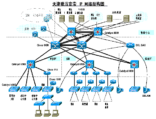 除以上三層之外,在塘沽電信局將建立一個數(shù)據(jù)中心,由兩臺Cisco Catalyst6509第三層交換機為數(shù)據(jù)中心提供數(shù)據(jù)交換及路由。接入的DSLAM設(shè)備,小區(qū)內(nèi)的樓層交換機及用戶前端設(shè)備(CPE)也屬于接入層。接入層主要為最終用戶提供多種寬帶接入方式。