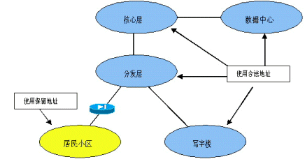 考慮IP地址資源有限,因此,居民小區(qū)接入用戶(hù)量大,地址使用效率低,因此在居民小區(qū)部分采用RFC 1519規(guī)定的保留地址,建議采用10.0.0.0。在每個(gè)小區(qū)的出口處配備地址轉(zhuǎn)換設(shè)備,實(shí)現(xiàn)保留地址和合法地址之間的轉(zhuǎn)換。