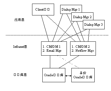 硬件平臺(tái)呈3層結(jié)構(gòu),分別為應(yīng)用層、Infranet計(jì)費(fèi)和用戶(hù)管理層以及數(shù)據(jù)庫(kù)層。