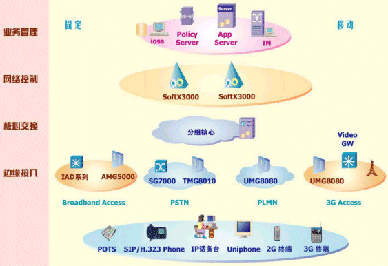 普通用戶可通過智能分組話音終端、多媒體終端接入,通過接入媒體網(wǎng)關(guān)、綜合接入設(shè)備(IAD)來滿足用戶的語(yǔ)音、數(shù)據(jù)和視頻業(yè)務(wù)的共存需求。