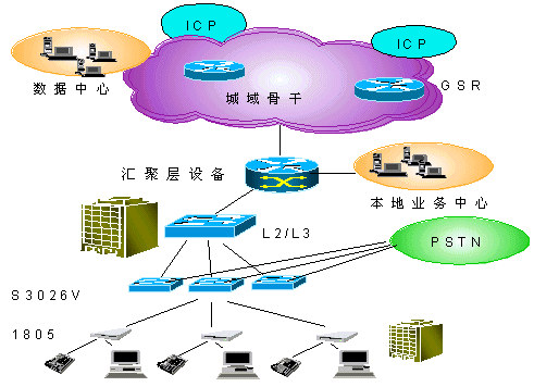 在用戶接入層Quidway S3026V提供24路VDSL接入,在普通雙絞線上提供12Mbps的雙向?qū)ΨQ數(shù)據(jù)業(yè)務(wù),傳輸距離最大可達1500m,在完成以太網(wǎng)接入的同時,不影響POTS業(yè)務(wù)。S3026V上行FE接口直接接入L3交換機。同時,通過雙絞用戶線完成了與PSTN交換機的相連,將寬帶、窄帶業(yè)務(wù)在S3026V上匯合,并通過已有雙絞電話線連接至遠端用戶設(shè)備(1805)。1805可以通過五類線與計算機網(wǎng)卡相連。