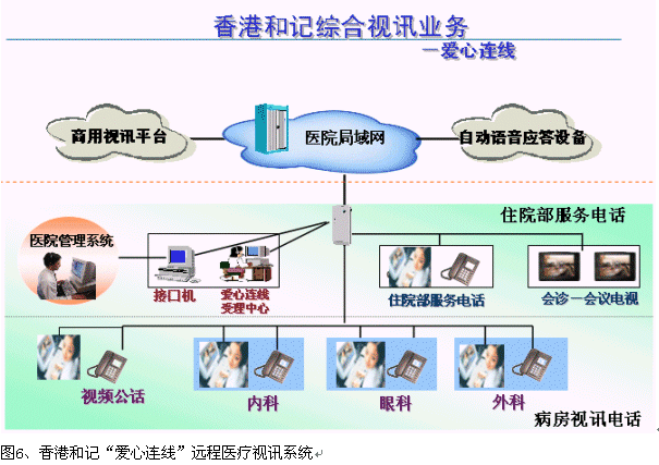目前,香港和記電信已經(jīng)在香港的"瑪麗醫(yī)院"大廳、非典病房、以及其他安全場(chǎng)所安裝了個(gè)人視頻系統(tǒng),通過該系統(tǒng),病人和家屬就可以進(jìn)行"面對(duì)面"的交流,無(wú)論對(duì)于非典病人的康復(fù),還是保護(hù)病人家屬,防止非典傳染都有及其重要的作用。
