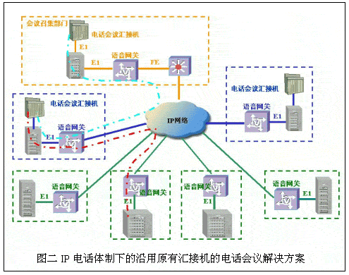伴隨著IP網(wǎng)的建設(shè)和VoIP電話系統(tǒng)標(biāo)準(zhǔn)的日益完善,許多行業(yè)、部門(mén)開(kāi)始在建設(shè)IP數(shù)據(jù)網(wǎng)的同時(shí),結(jié)合原有電話專(zhuān)網(wǎng)的改造,著手建設(shè)IP電話網(wǎng)絡(luò)。在IP電話網(wǎng)上實(shí)現(xiàn)原有的電話會(huì)議業(yè)務(wù)也就隨之提到日程上來(lái)。華為公司結(jié)合IP電話的特點(diǎn)和保護(hù)用戶(hù)已有投資的角度,提出延用電話會(huì)議匯接機(jī)和采用華為專(zhuān)用IP電話會(huì)議控制系統(tǒng)兩套解決方案: