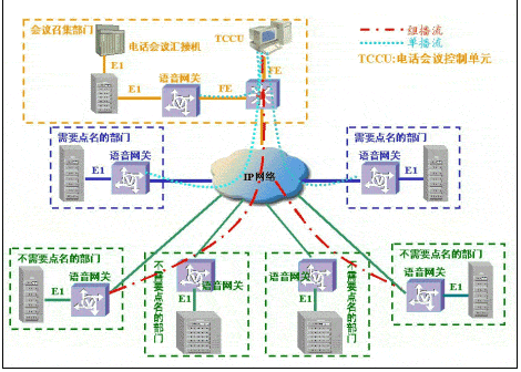 采用原有的會(huì)議電話架構(gòu),只是話音的長(zhǎng)途連接由模擬專(zhuān)線等改為IP傳輸。方案由于采用原有電話會(huì)議匯接機(jī),保護(hù)了用戶(hù)的原有投資。缺點(diǎn)是在召開(kāi)多級(jí)會(huì)議電話時(shí),由于語(yǔ)音信號(hào)首先在召集單位語(yǔ)音網(wǎng)關(guān)進(jìn)行壓縮,經(jīng)IP傳輸后,在二級(jí)單位語(yǔ)音網(wǎng)關(guān)解壓縮還原為模擬話音,再經(jīng)二級(jí)單位的語(yǔ)音網(wǎng)關(guān)二次壓縮,經(jīng)IP網(wǎng)傳輸后,在三級(jí)單位的語(yǔ)音網(wǎng)關(guān)上二次解壓縮,導(dǎo)致語(yǔ)音信號(hào)多次壓縮/還原,對(duì)語(yǔ)音質(zhì)量損傷較大。