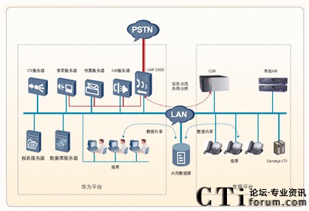 客戶電話通過PSTN統(tǒng)一由華為UAP3300排隊機接入,由華為平臺的IVR服務(wù)器進(jìn)行業(yè)務(wù)導(dǎo)航分流,根據(jù)用戶的選擇和IVR流程的配置進(jìn)行路由,可以選擇不同平臺來處理此業(yè)務(wù)。來話根據(jù)IVR流程路由后,兩個平臺采用負(fù)荷分擔(dān)方式進(jìn)行工作。在將來話導(dǎo)入兩個平臺后,采用不同設(shè)備的IVR進(jìn)行業(yè)務(wù)分配,不同平臺的座席處理不同的業(yè)務(wù)。在處理過程中,不同平臺的座席之間可以互轉(zhuǎn),達(dá)到全網(wǎng)資源共享的功能。