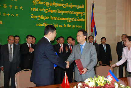 圖:左邊是華為公司東南亞地區(qū)部副總裁張振軍,右邊是CamGSM的主席KITH MENG。