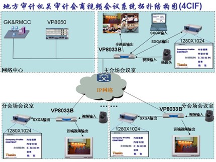 本系統(tǒng)在審計(jì)署機(jī)房配置網(wǎng)絡(luò)控制中心GK、多點(diǎn)資源管理系統(tǒng)和ViewPoint 8660 MCU設(shè)備。多點(diǎn)資源管理中心實(shí)現(xiàn)對(duì)MCU、電視會(huì)議和全網(wǎng)資源的統(tǒng)一調(diào)度,GK實(shí)現(xiàn)對(duì)IP終端入會(huì)時(shí)鑒權(quán)認(rèn)證,在主會(huì)場(chǎng)會(huì)議室架設(shè)一臺(tái)ViewPoint 8033B分體式視訊終端。在各分會(huì)場(chǎng)會(huì)議室架設(shè)一臺(tái)ViewPoint 8033B分體式視訊終端;在所有會(huì)場(chǎng)各架設(shè)一臺(tái)標(biāo)清攝像機(jī)、一個(gè)麥克風(fēng)、一臺(tái)高清電視或一臺(tái)高清投影機(jī)。