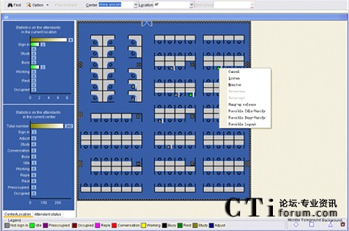 系統(tǒng)提供一整套管理工具,輔以圖形化的人性設(shè)計,將復(fù)雜的設(shè)備維護(hù)和系統(tǒng)優(yōu)化簡化為簡單的圖形管理,降低了維護(hù)難度和對維護(hù)人員的要求,提高了維護(hù)效率,使聯(lián)絡(luò)中心更為穩(wěn)定可靠地運(yùn)行。座席地圖按真實(shí)座席位置展現(xiàn)座席狀態(tài),使業(yè)務(wù)代表服務(wù)質(zhì)量的監(jiān)控和檢查更為形象高效,有利于提升業(yè)務(wù)代表服務(wù)質(zhì)量。