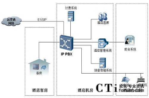 提供入住和退房服務,提供PMSI接口,提供語音郵箱業(yè)務、呼叫權限等應用。
