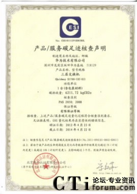 CTI論壇(ctiforum)5月23日消息(記者 楊佳林):全球領(lǐng)先的ICT解決方案供應(yīng)商華為宣布,華為S5700系列交換機(jī)產(chǎn)品(共4款,S5700-28-EI-24S、S5700-48TP-SI-AC、S5700-52C-EI、S5700-52C-SI)經(jīng)中國(guó)電子技術(shù)標(biāo)準(zhǔn)化研究所認(rèn)證中心(以下簡(jiǎn)稱CESI)認(rèn)證核查,產(chǎn)品碳足跡量化過(guò)程符合核查準(zhǔn)則要求,獲得“碳足跡認(rèn)證”證書。這是國(guó)內(nèi)第一張交換機(jī)產(chǎn)品碳足跡認(rèn)證證書,10日在深圳舉行的“2012中國(guó)碳排放認(rèn)證認(rèn)可技術(shù)國(guó)際論壇”上,主辦方CESI向華為授予了該證書。
