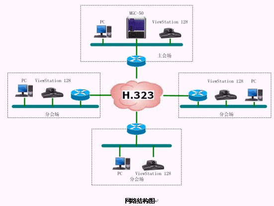 結(jié)合遼寧省消防網(wǎng)絡,本方案設計的視頻會議系統(tǒng)承載在遼寧省消防局的IP網(wǎng)絡平臺上,采用國際流行的ITU H.323通信標準。系統(tǒng)采用以MCU為中心輻射各個會場電視會議終端的星型網(wǎng)絡結(jié)構。整套系統(tǒng)由16個會場組成,采用美國Polycom公司的ViewStation 128會議室型終端設備。網(wǎng)管中心安放一臺Polycom 公司的MGC-50(多點會議控制單元),用于對全網(wǎng)終端的控制,實現(xiàn)多點、點對點的會議。
