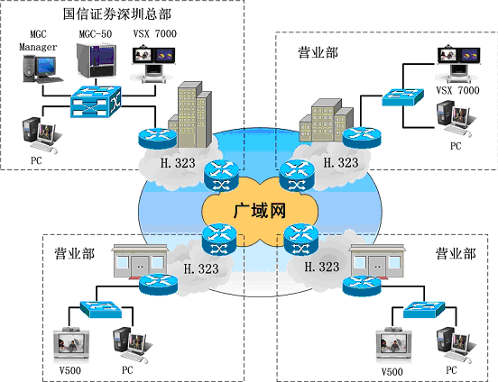 國信證券有限責(zé)任公司為全國性大型綜合類證券公司,總部在深圳,在全國二十一個城市擁有二十多家營業(yè)部及服務(wù)網(wǎng)點(diǎn)。隨著國信證券規(guī)模的不斷擴(kuò)大和內(nèi)外交流的增加,公司領(lǐng)導(dǎo)希望借助視頻會議的高效、快捷等特點(diǎn),提高管理效率、統(tǒng)一管理、降低企業(yè)的管理運(yùn)作成本、減少公司的巨額通訊費(fèi)用和差旅費(fèi)用。