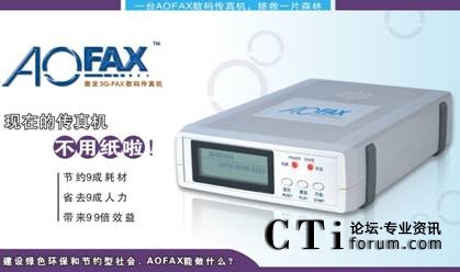 CTI論壇(ctiforum)10月20日消息(記者 潘婷婷):傳真機自1906年發(fā)明以來,到今天已走過一百多年的歷史,傳真的形式也從最早的機械傳真機、光電傳真機、數字傳真機發(fā)展到今天的電子傳真、電腦傳真、網絡傳真、無紙傳真、傳真軟件、傳真系統(tǒng)、傳真服務器等。其中,由金恒科技(深圳)有限公司推出的傲發(fā)3G-FAX電子傳真系列產品(AOFAX),是新一代傳真的典范,引領著未來傳真發(fā)展的方向。