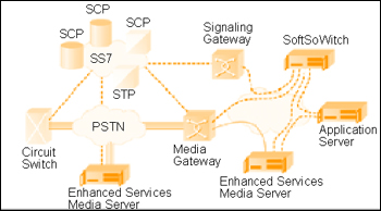 在PSTN網(wǎng),交換機組、SCP(Service Connection Points)和媒體服務(wù)器協(xié)同工作,為用戶提供服務(wù)。在包交換網(wǎng)絡(luò)環(huán)境,這種服務(wù)由軟件交換機(Softswiches)、媒體服務(wù)器和應(yīng)用服務(wù)器協(xié)同提供。連接這兩種網(wǎng)絡(luò)的橋梁是媒體網(wǎng)關(guān)和信令網(wǎng)關(guān)。值得注意的是,包交換中的部件都是邏輯點,其多個部件可能僅僅由網(wǎng)絡(luò)中的一個應(yīng)用硬件平臺提供。例如:一個基于網(wǎng)絡(luò)提供語音識別功能的語音郵件系統(tǒng)可能包括如下模塊: