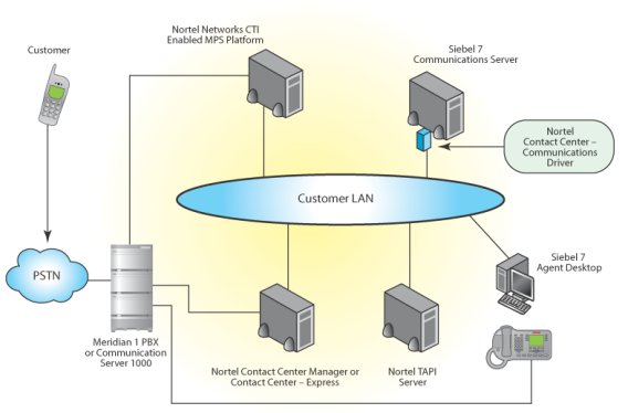 PBXX或通信服務(wù)器1000、北電聯(lián)絡(luò)中心管理器或快速聯(lián)絡(luò)中心、北電TAPI服務(wù)器、Siebel7座席桌面系統(tǒng)
