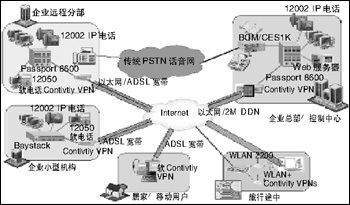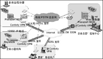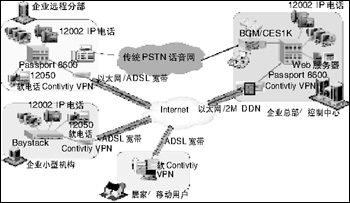 在企業(yè)網上加載北電網絡話音設備(BCM,CSE1K或ITG/M1),再配合上北電網絡的IP電話i2002/i2004,或在移動用戶的PC上安裝i2050