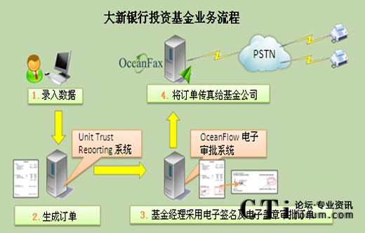 大新銀行Information Technology Division作出多方研究及比較,最終選定OceanX旗艦產(chǎn)品、市場(chǎng)增長(zhǎng)第一并屢獲殊榮的OceanFax傳真服務(wù)器作為電子傳真工具;并與Unit Trust Reporting系統(tǒng)及OceanX另一旗艦產(chǎn)品OceanFlow電子審批系統(tǒng)整合,理順投資基金業(yè)務(wù),實(shí)現(xiàn)自動(dòng)流程,包括訂單生成、審批及傳真發(fā)送流程。